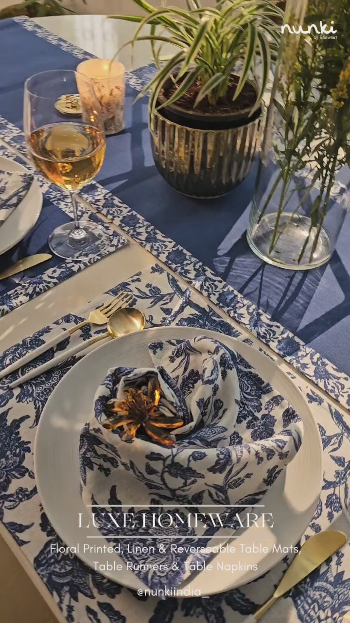 Experience the epitome of table elegance with our printed canvas reversible table mats paired with reversible linen table runners and napkins, adorned with delightful floral wonders. These stunning pieces not only elevate your table setting with a touch of